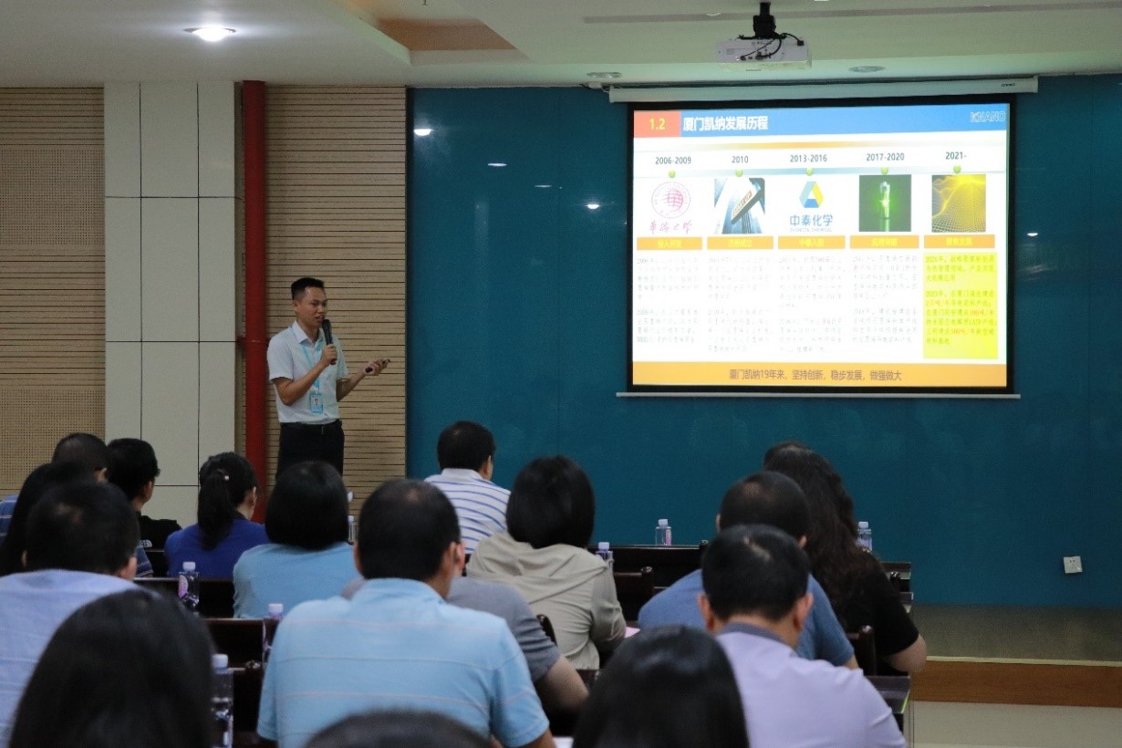 隨后,公司技術中心負責人洪江彬詳細匯報了凱納公司自創立以來的發展歷程、核心技術突破及產業化落地成果,重點展示了公司在石墨烯、碳納米管、固態電池電解質等新材料領域的創新進展,并圍繞新能源鋰電池導電漿料的低粘穩粘分散技術、碳納米管的分散技術以及低成本超細石墨烯粉體技術與廈大專家團展開交流。
